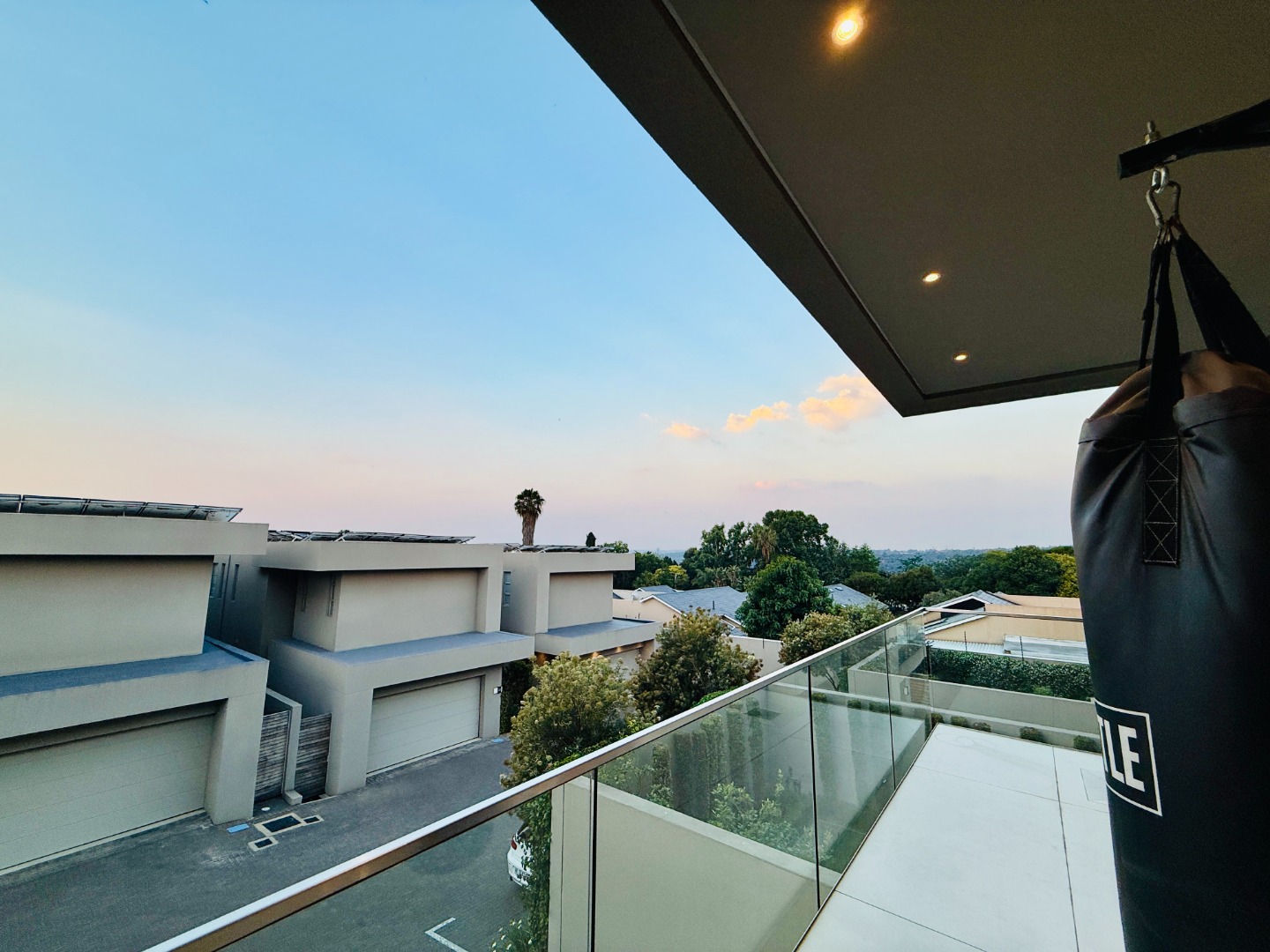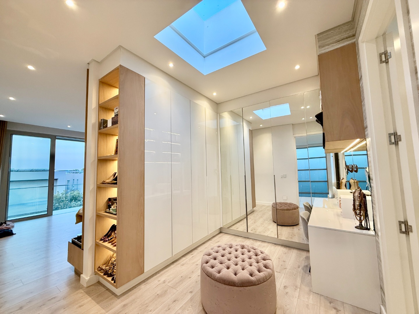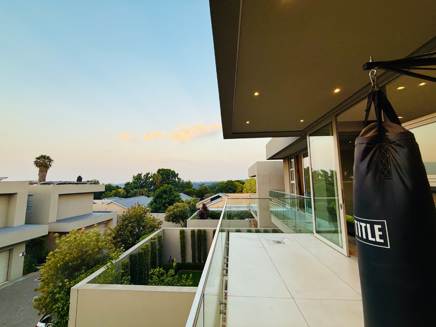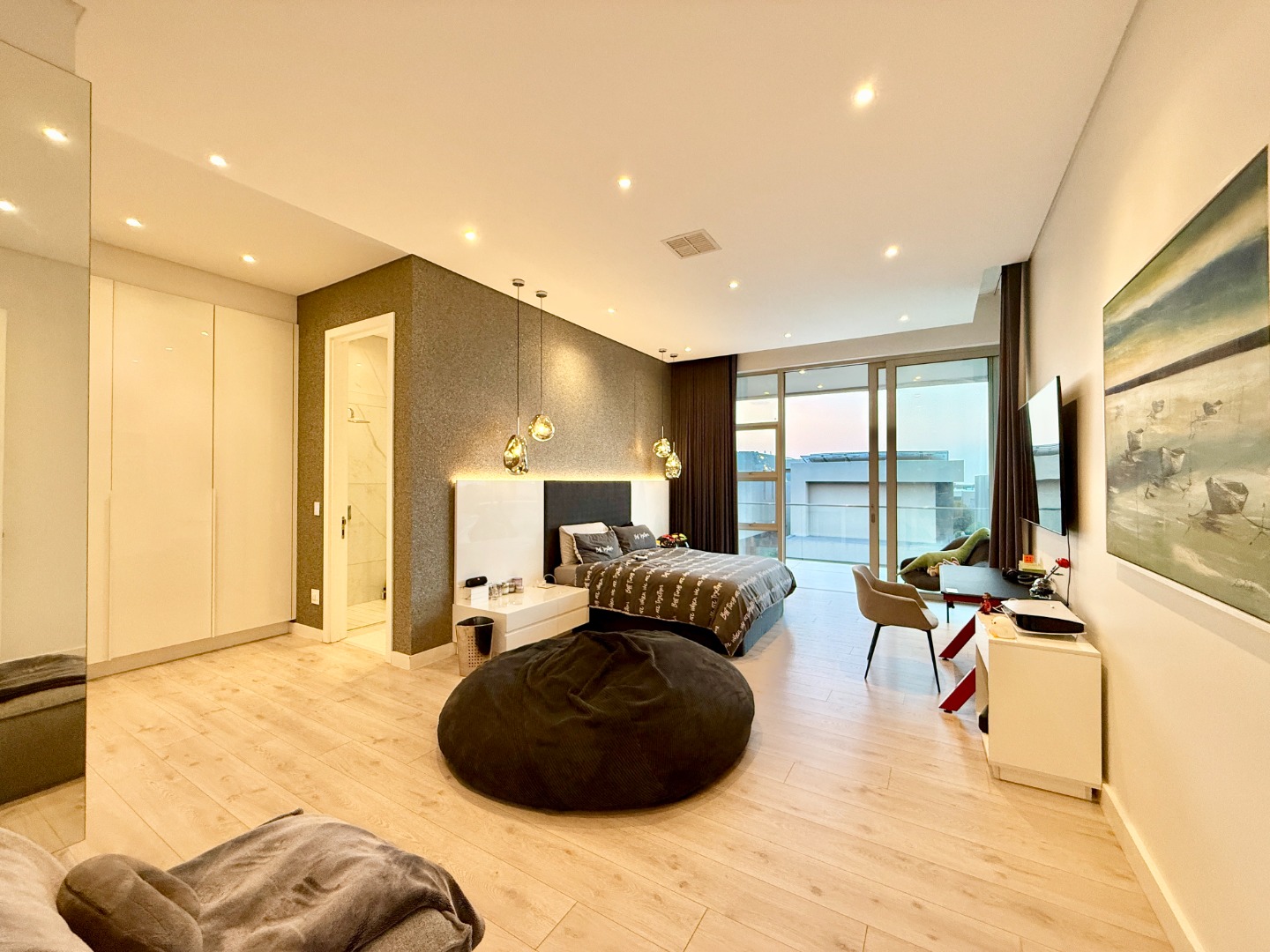 Upstairs, the luxury continues. The main bedroom suite is a true retreat, featuring a massive walk-in dressing area, an opulent full ensuite bathroom, and a private balcony framing breathtaking views of the Sandton skyline and golden sunsets. Each of the four spacious ensuite bedrooms is beautifully furnished, featuring walk-in closets, premium finishes, and abundant natural light — the result of the home’s clever design and strategically placed skylights that allow sunlight to pour in throughout the day. Two bedrooms enjoy access to expansive balconies, creating serene spaces for morning coffee or evening reflection.