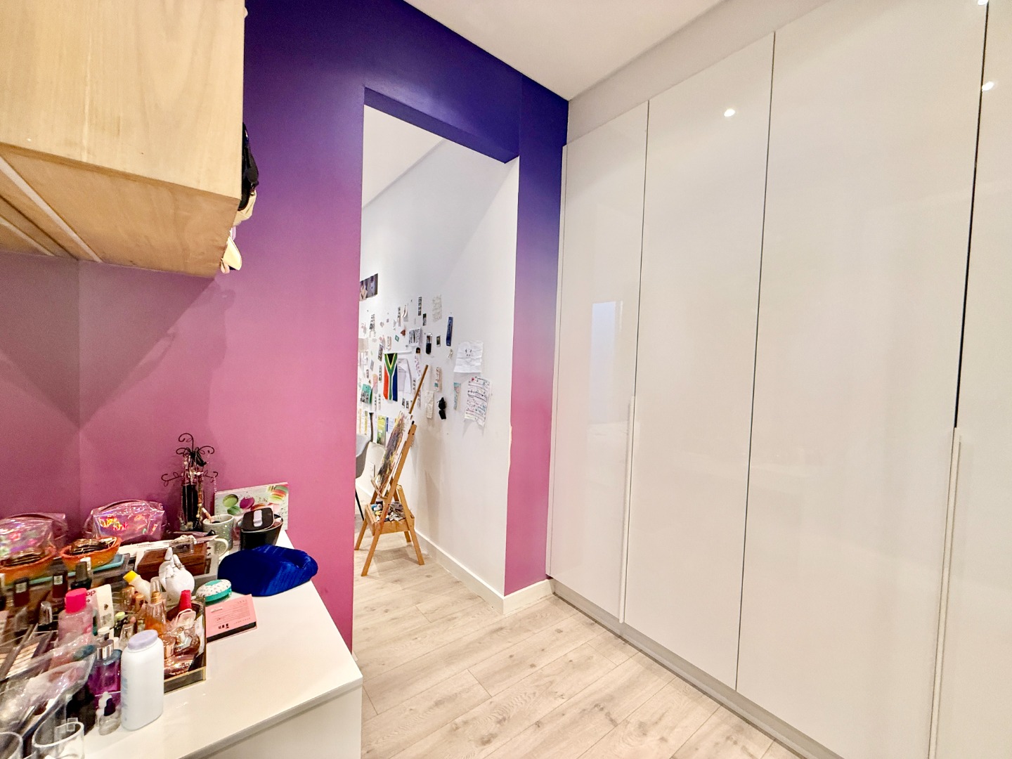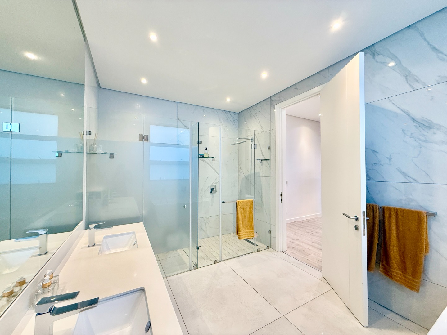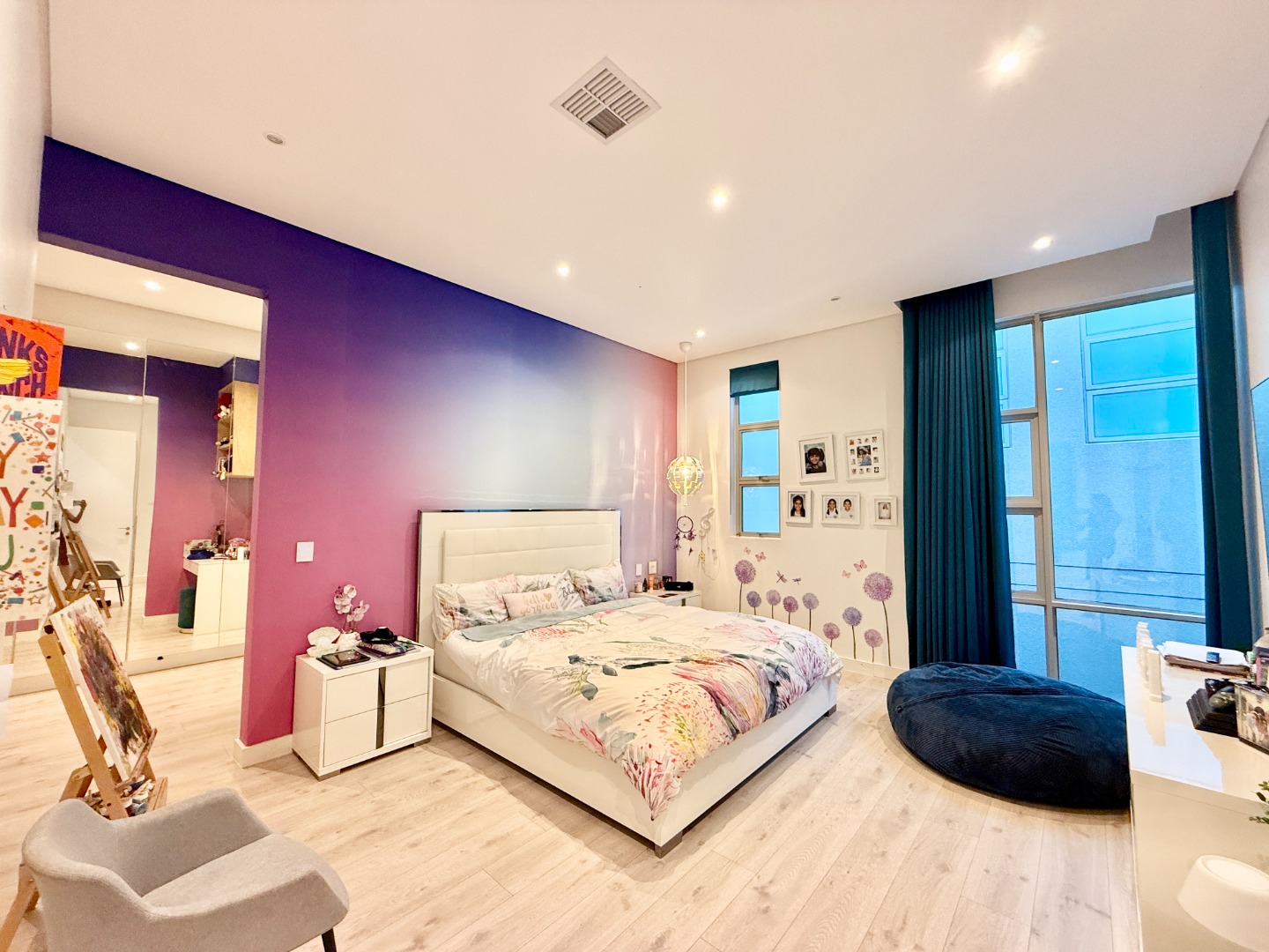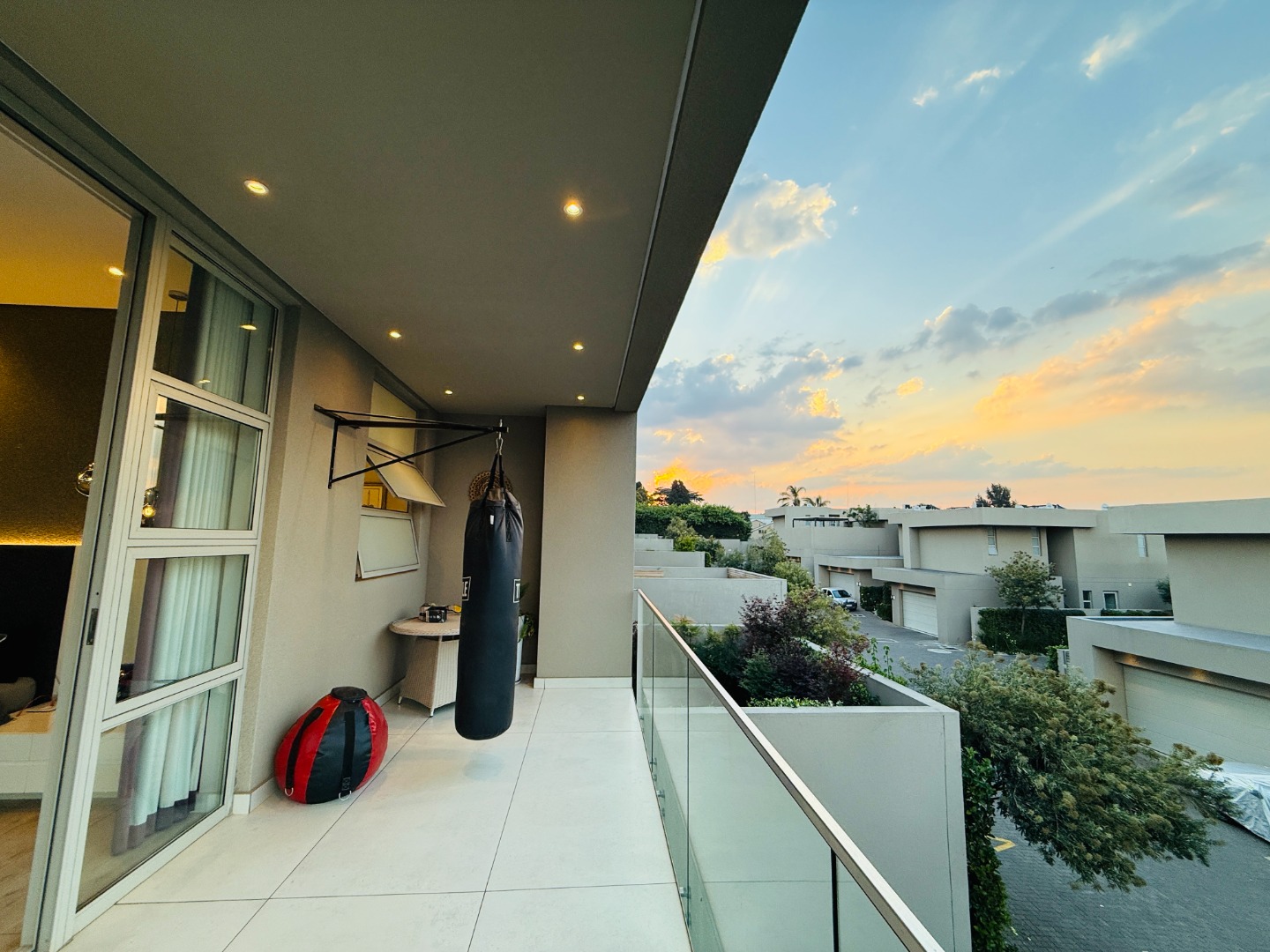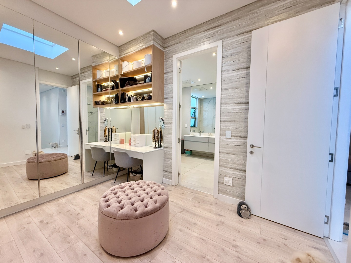 Upstairs, the luxury continues. The main bedroom suite is a true retreat, featuring a massive walk-in dressing area, an opulent full ensuite bathroom, and a private balcony framing breathtaking views of the Sandton skyline and golden sunsets. Each of the four spacious ensuite bedrooms is beautifully furnished, featuring walk-in closets, premium finishes, and abundant natural light — the result of the home’s clever design and strategically placed skylights that allow sunlight to pour in throughout the day. Two bedrooms enjoy access to expansive balconies, creating serene spaces for morning coffee or evening reflection.